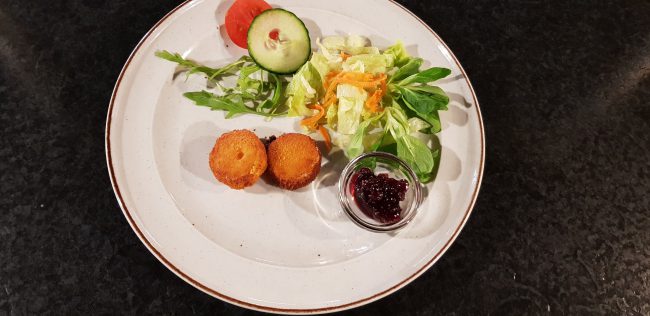 Ziegenkäsetaler paniert mit Preiselbeeren und Salatgarnitur, Brot